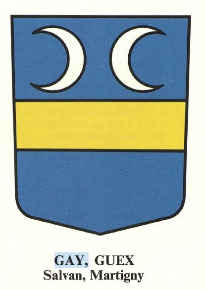 Famille de la vallée de Salvan qui apparaît avec Jean Guay, dont le fils François est cité en 1362 et 1370. Etablie d'abord au Giétroz ou Vieux-Finhaut, la famille figure dans des reconnaissances de 1399-1438 et se divise en plusieurs branches qui se distinguent par l'adjonction du nom de leur habitation: 1° Gay de la Barmaz ou Balmaz (grotte, abri sous roche), puis Gay-Balmaz; 2° Gay des Creuses (plutôt que des croix, il s'agit peut-être de creux), puis Gay-Crosier ou Guex-Crosier; 3° Gay des Combes. Par suite de mariages, des Fontanasse ou Fontanessy aux Granges et des Fabri ou Favre à Salvan seraient devenus des Gay. La famille a donné plusieurs magistrats : Pierre, syndic de Salvan en 1685; Louis, châtelain 1803-1809; François-Nicolas, châtelain 1829-1830, député à la Diète cantonale 1839; Emmanuel, vice-président, député au Grand Conseil 1844. La famille a essaimé hors de la vallée de Salvan: Claude Gay, de Salvan, habite Saint-Pierre-de-Clages en 1585. A Miéville (Vernayaz), une branche de la famille Gay ou Guez est établie déjà au XVIIe siècle, et trois de ses membres: Pierre, Maurice et François Guez, sont reçus communiers de Dorénaz en 1647. François Guex-Crosier, du Châtelard, et Pierre-Germain, de Finhaut, sont reçus bourgeois de Martigny en 1670, où sont aussi reçus bourgeois Maurice Guex, du Giétroz, 1677; Claude Guex, de Salvan, 1679; Jean Guex, de Finhaut, 1710; Joseph Guex, de Finhaut, 1719. Gaspard Gay de la Balmaz est reçu bourgeois de Chamoson 1699; Joseph Gay des Combes, à Martigny- Combe 1864; Eugène Gay, des Jeurs, à Finhaut 1914. Evionnaz a reçu des Gay du Cergneux avant 1800, et le canton de Fribourg des Gay de Miéville vers 1860. J.-B. Bertrand (Annales valaisannes, 1922) et L. Coquoz (ibid., 1924) rattachent les Gay de Saxon et de Saillon à la vallée de Salvan; Jean-Baptiste Gay (1813-1894), de Saillon, avocat, s'établit à Saint-Maurice où il fut reçu bourgeois en 1848 et présida la Municipalité 1852-1853. Un rameau de Finhaut est admis à la bourgeoisie de Salins au XIXe siècle. Des familles Gay de Vernayaz en 1922, de Finhaut en 1930, sont agrégées à Genève; des Gay-Balmaz de Vernayaz en 1930 et de Salvan en 1961, sont aussi reçus à Genève, ainsi que des Gay-Crosier de Trient en 1919 à Genève, et des Gay des Combes de Martigny en 1959 à Vandoeuvres (Genève). Joseph Gay des Combes (1879-1956), fils d'Edouard, de Finhaut, est admis à la bourgeoisie de Sion en 1924; son fils Edmond, né à Sion en 1905, notaire, avocat, Dr en droit, député au Grand Conseil 1937, qu'il présida 1943-1944, professeur à l'Université de Genève, colonel. Plusieurs prêtres, chanoines de Saint-Maurice et du Saint-Bernard, capucins.